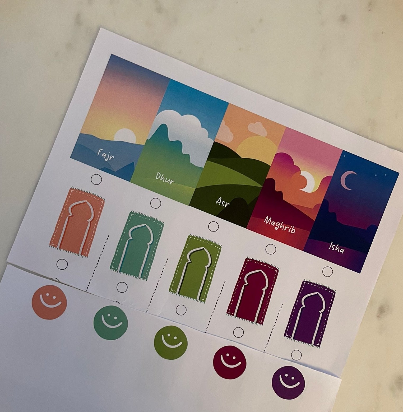 Entlang der Linien ausschneiden und Haftpunkte anbringen, um jedes einzelne Gebet zuzukleben, das man verrichtet hat.